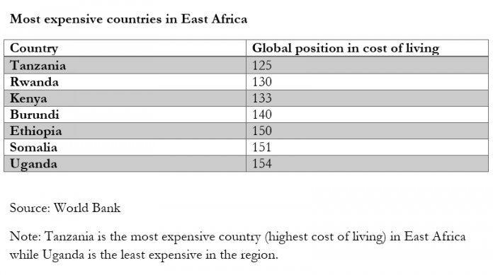 In East Africa, Tanzania has the highest cost of living, ranked at 125 worldwide, followed by Rwanda (130) while Kenya, the region’s largest economy, comes in third at position 133 globally.
