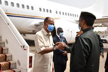 Eritrea President Isaias Afworki arrives in Khartoum. The current visit to the Sudan will focus on enhancement of bilateral ties as well as consolidation of ongoing endeavor for regional cooperation and integration. Pic