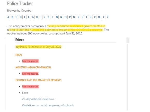 እቲ ኣህጉራዊ ፊናንስያዊ ትካል፣ 196 ሃገራት፣ ምስ ለበዳ ኮረና ቫይረስ ተተሓሒዙ ዝወስድኦ ዘለዋ ናይ ቁጠባን ፊናንስን ስጉምታት ብዝምልከት፣ ብ31 ነሓሰ ኣብ ዘውጽኦ ዝርዝራዊ ጸብጻብ’ዩ መንግስቲ ኤርትራ ዝወሰዶ ቁጠባዊ ስጉምቲ ከምዘየለ ዘነጸረ።