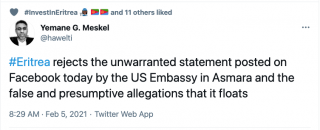 የኤርትራው ባለስልጣን አቶ የማነ ገብረመስቀል በትዊተር ገጻቸው እንዳሉት ኤርትራ ዛሬ በፌስ ቡክ አስመራ የሚገኘው የአሜሪካ ኤምባሲ በፌስቡክ ላይ የለጠፈውን ያልተጠበቀ መግለጫ እና እሷም ተንሳፋፊ ናት በሚል የተሳሳተ እና ግምታዊ ክስ አልተቀበለችም ፡፡