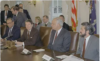 Ronald Reagan is flanked by Nicaraguan rebel leaders. From left: Arturo Cruz, Reagan, Adolfo Calero, and Alfonso Robelo during a meeting in Washington, D.C., March 3, 1986. (Bettmann via Getty Images)