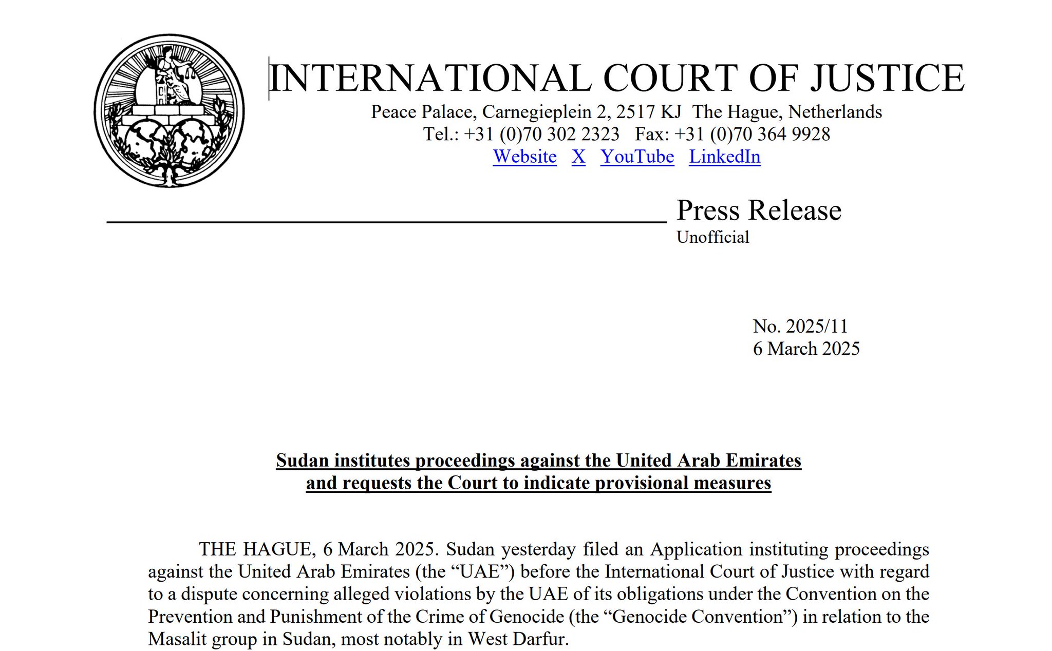 PRESS RELEASE: Sudan institutes proceedings against the United Arab Emirates before the ICJ and requests the Court to indicate provisional measures.