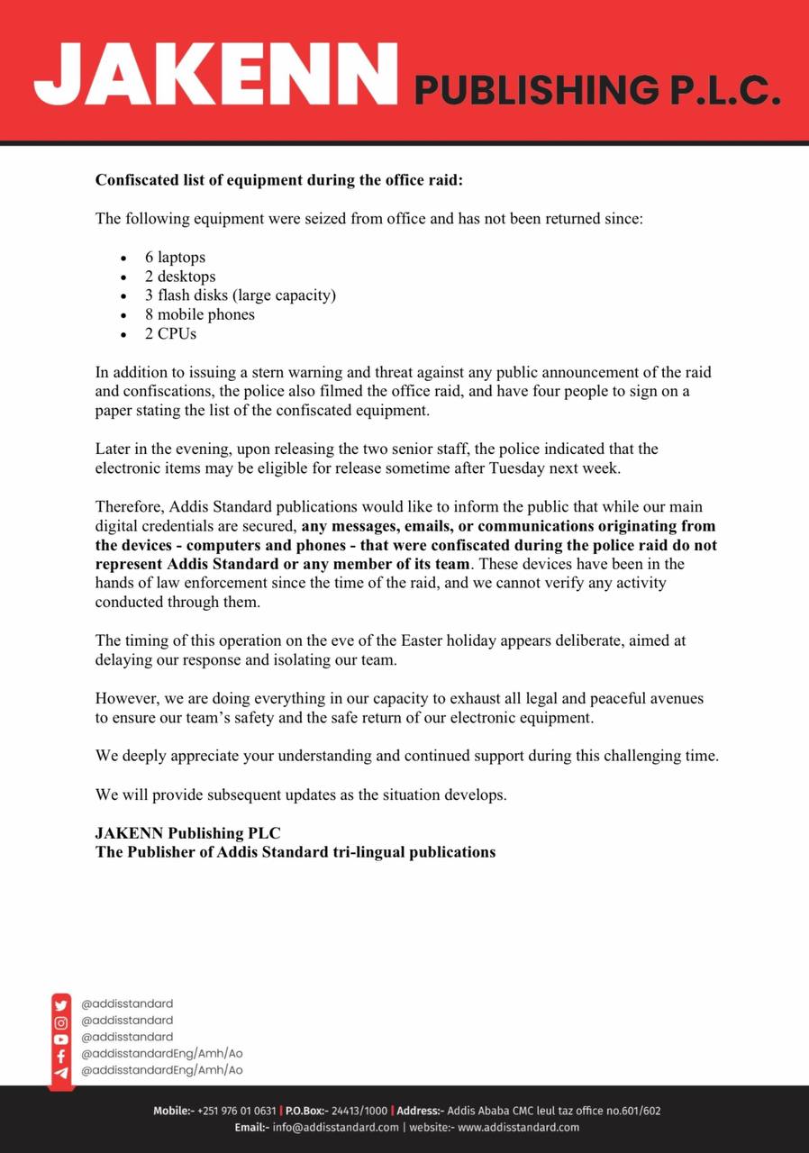 Public notice regarding federal police raid on Addis Standard and mass confiscation of electronic devises