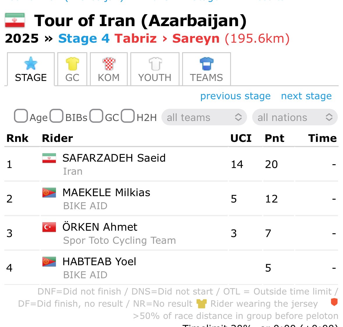 We wait to hear what effect this has on the GC, with BIKE AID’s Dawit Yemane in yellow at the start of stage 4…