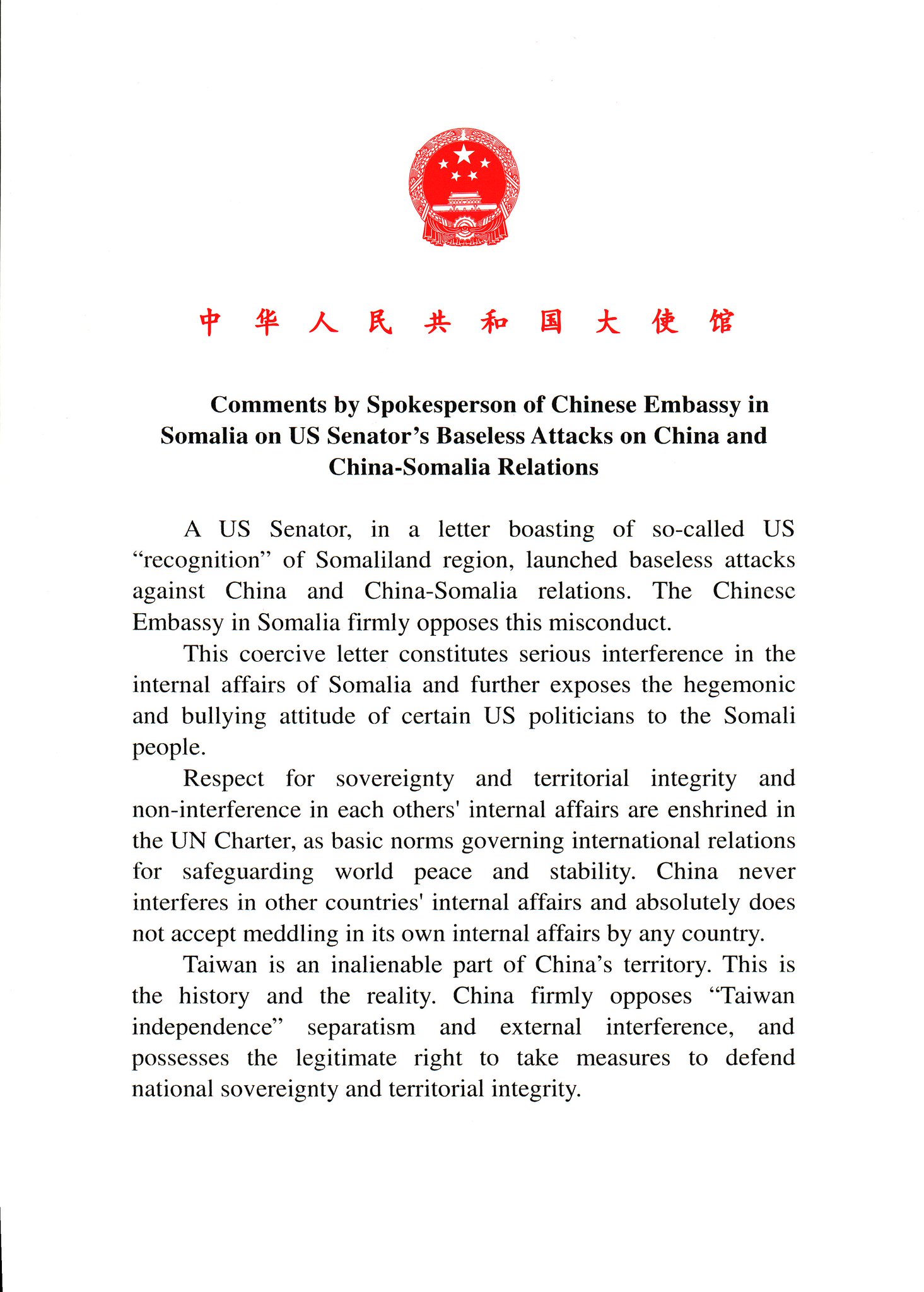 Comments by Spokesperson of Chinese Embassy in Somalia on US Senator’s Baseless Attacks on China and China-Somalia Relations.