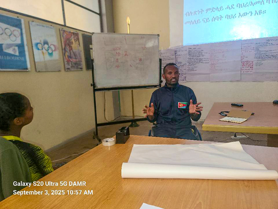 Paralympic athlete Sebahtu Kesete guided around 40 young table tennis players from all regions of Eritrea, focusing on Olympic values and excellence during their ongoing training. Young athletes aged 12–15 are participating in a two-week training and competition program, sponsored by the National Olympic Committee and organized by the National Table Tennis Federation. Via Ghebretnsae Damr