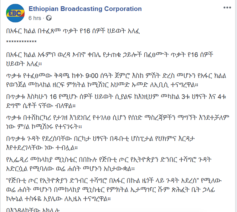 More than 16 killed in Afar by armed men who came from Djibout. The Ethiopia military does nothing?