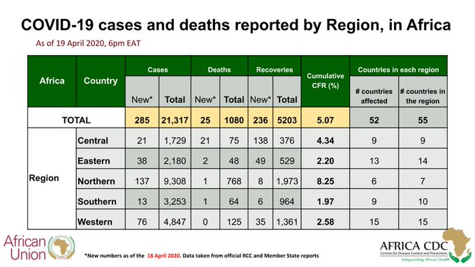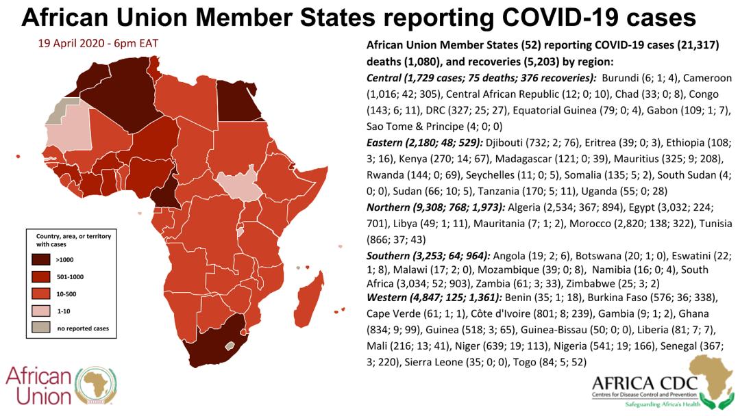 52 African Union Member States reporting 21317 cases, 1080 deaths, and 5203 recoveries
