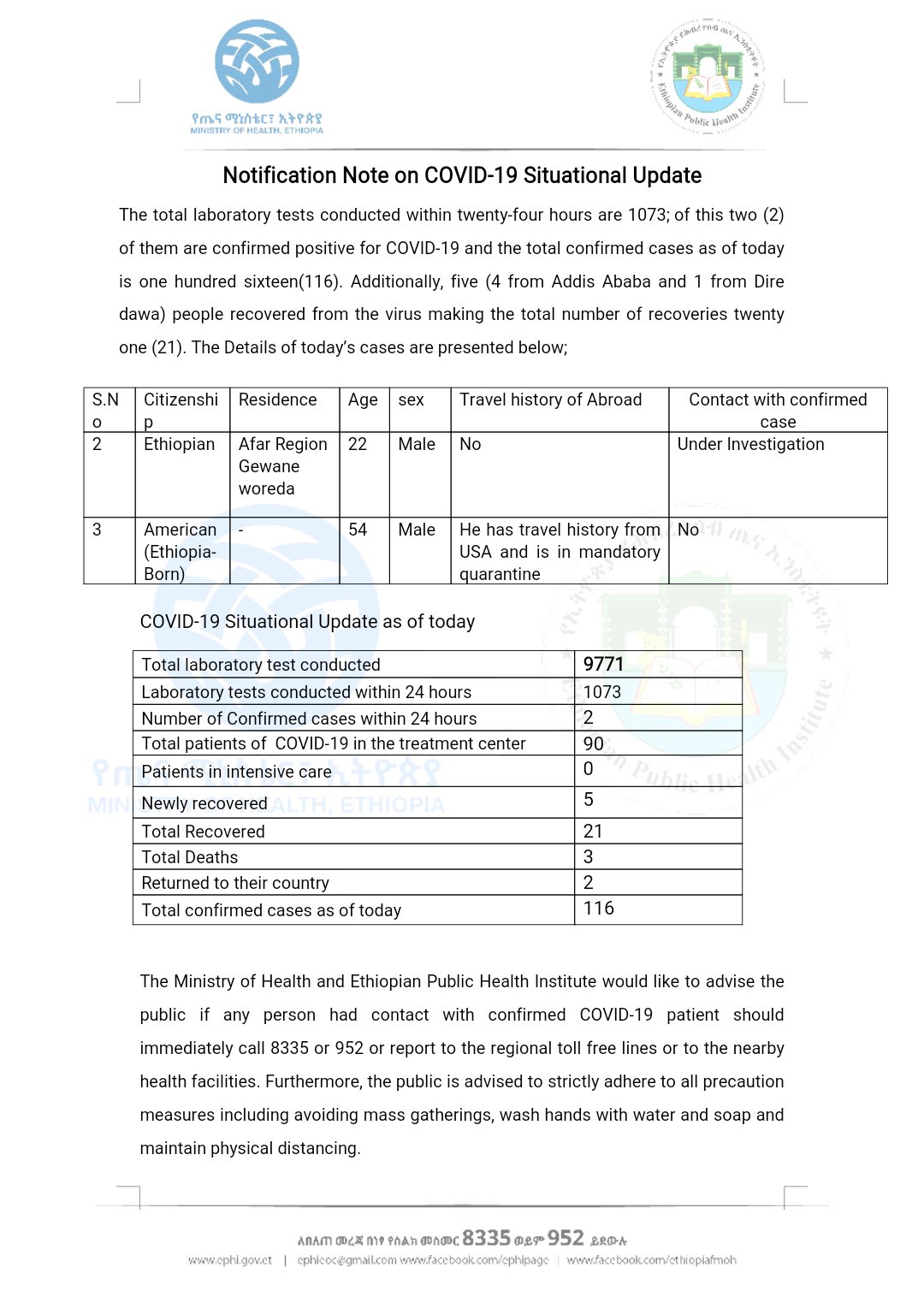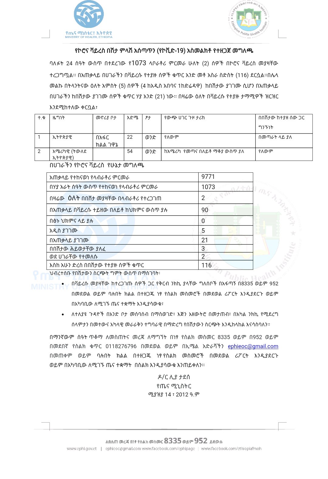 ባለፉት 24 ሰዓት ውስጥ በተደረገው 1073 የላብራቶሪ ምርመራ ሁለት (2) ሰዎች በኮሮና ቫይረስ መያዛቸው ተረጋግጧል፡፡ በአጠቃላይ በሀገራችን በቫይረሱ የተያዙ ሰዎች ቁጥር አንድ መቶ አስራ ስድስት (116) ደርሷል፡፡