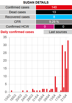 - Confirmed cases: 140 including 133 cases in Khartoum.