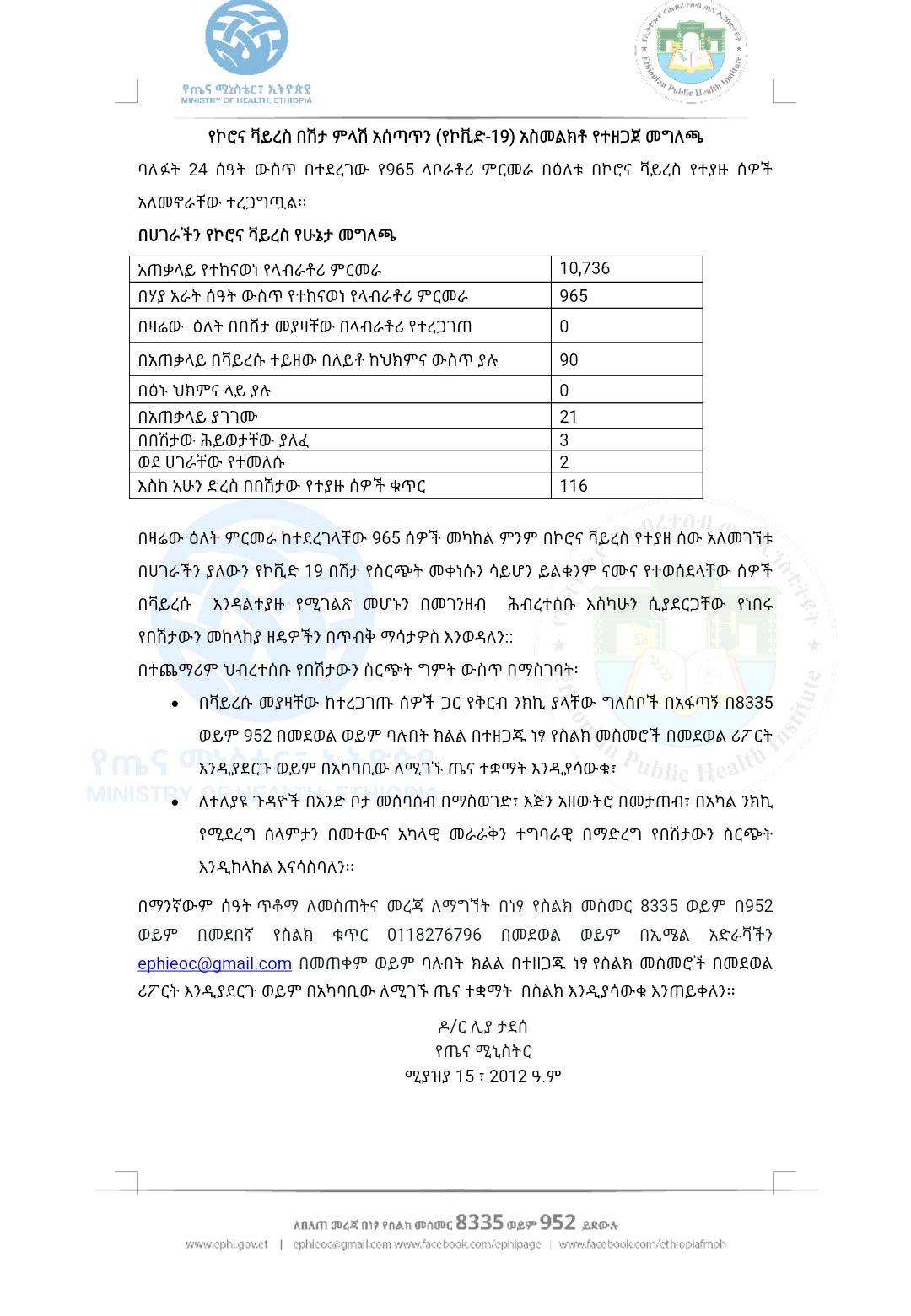 በኮሮና ተሕዋሲ የተለከፈዉ ሰዉ ቁጥር ዛሬ ከ2.6 ሚሊዮን በልጧል።የተሕዋሲዉን ስርጭትና የሟቹን ቁጥር የሚያጠኑ የተለያዩ ተቋማት ዛሬ እንደዘገቡት በተሕዋሲዉ ከፍተኛ ቁጥር ያለዉ ሕዝብ የተለከፈባት ዩናይትድ ስቴትስ ናት።ከ826 ሺሕ በላይ።ስጳኝ 208 ሺሕ ሕዝብ ሲለከፍባት፣ ኢጣሊያ በ183 ሺሕ በሽተኛ የ3ተኝነቱን ደረጃ ይዛለች።በሟቾች ቁጥርም ዩናይትድ ስቴትስ ከዓለም የመጀመሪያዉን ሥፍራ እንደያዘች ነዉ።ዛሬ በተጠናቀረዉ ዘገባ መሠረት ዩናይትድ ስቴትስ ዉስጥ የሞተዉ ሰዉ ቁጥር ከ45 ሺሕ 5 መቶ በልጧል። ኢጣሊያ በሟቾቹ ቁጥር ሁለተኛዉን ሥፍራ ስትይዝ፣ የሟቾቹ ቁጥር 24 ሺሕ 6 መቶ ግድም ነዉ።ስጳኝ ዉስጥ ከ21 ሺሕ 7መቶ በላይ ሕዝብ ሞቷል።የኢትዮጵያ ጤና ሚንስቴር ዛሬ እንዳስታወቀዉ በተሕዋሲዉ የተለከፈዉ ሰዉ ቁጥር 116 ደርሷል።ሚንስቴሩ አክሎ እንዳለዉ እስከ ዛሬ ቀትር ግድም ድረስ በነበረዉ 24 ሰዓት ዉስጥ 1ሺሕ 73 ሰዎች ተመርምረዉ ሁለቱ በተሕዋሲዉ መለከፋቸዉ ተረጋግጧል።ኢትዮጵያ ዉስጥ በኮቪድ 19 3 ሰዎች ሞተዋል።በኮሮና ተሕዋሲ የሚለከፈዉ ሰዉ ቁጥር በአንዳድ ሐገራት በመጠኑ ቢቀንስም በብዙ ሐገራት ግን ተሕዋሲዉ አሁንም በርካታ ሰዉ እየለከፈ ነዉ።