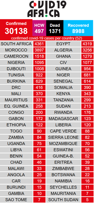 52 African Union Member States reporting 30329 cases, 1374 deaths, and 9106 recoveries