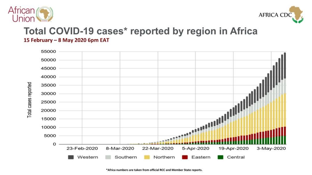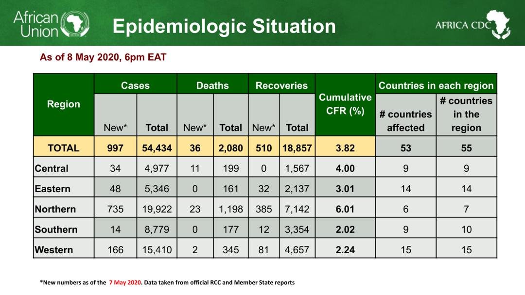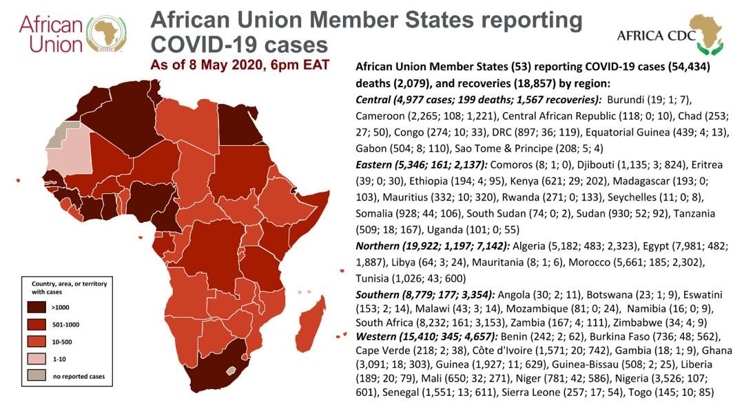 53 African Union Member States reporting 54,434 cases, 2,079 deaths, and 18,857 recoveries.