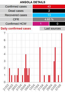 Total: 43 confirmed cases (all located in Luanda), 13 recoveries and 2 deaths.