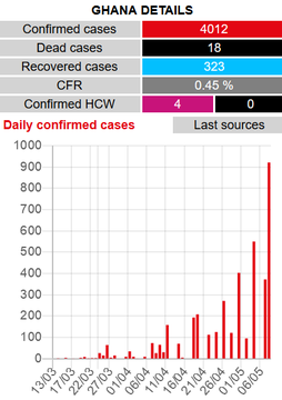 Total: 4012 confirmed cases (3046 cases in the Greater Accra region), 18 deaths and 323 recoveries.The Ghana Health Service says more than half of the 921 new COVID19 cases added to the country’s case count is as a result of an outbreak in an industrial facility with 1,300 workers of which 533 have been confirmed positive.