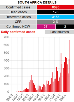South Africa reports 663 new cases of coronavirus, 8,895 cases in total.
