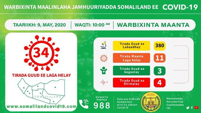 Somaliland records 11 new cases of COVID19–the highest number of cases the country reports in a single day with 1 deaths. This brings total nationwide infections to 34 and 4 deaths –Ministry of Health