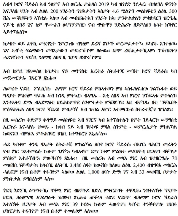 ኣነ ነዚ ዜና ከቕርብ እንከለኹ፡ ናይ ሓያሎ መዓልታት መጽናዕትን እኹል ዝኾነ ጸብጻብ ካብ ዝተፈላለዩ ሃገራትን ብፍላይ ካብ ዓለም ለኻዊ ጥዕናን እሙናት ምንጭታት ዝረኸብኩዎ ሓቂ’ዩ። ስለዚ ኤርትራ ንመኸተ ኮሮና ቫይረስ ንምብዳህ ዘርኣይዎ ዘይሕለል ጻዕሪ፡ ዘዕግብ እዩ። እዚ ማለት ፍጹም ሸለልትነት ኣወጊዶም ኣብ ዝተዋህቦም ትእዛዝ መንግስትን ሰብ ሞያን ይኽተሉ ብምንባሮም ማዕረ ክንደይ ንሃገሮምን ህዝቦምን ከም ዘፍቕሩ ዘመስከርሉ መድረኽ እዩ። እዚ ስለዝኾነ’ውን ብህጹጽ ንኮሮና ቫይረስ ክብድህዎ ክኢሎም።