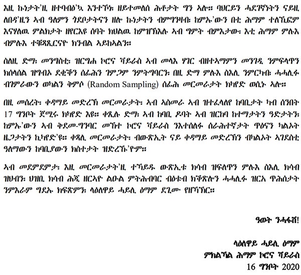 Starting Sunday May 17, Eritrea announced it will start to conduct massive COVI-19 testing to residents of Asmara through random sampling to all towns and villages near the border area and all front line health workers.