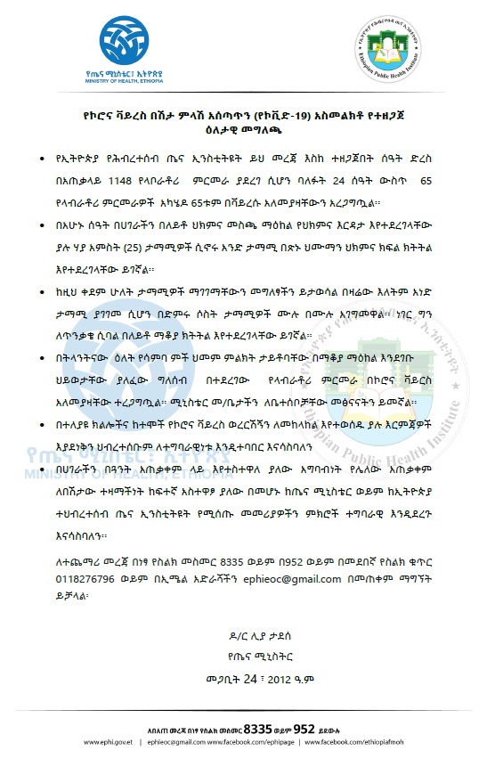 ኮቪድ19 ላይ ጤና ሚኒስቴር የሚያወጣቸውን ወቅታዊ መረጃዎች ለመከታተል በሚከተለው ማስፈንጠሪያ ይጠቀሙ፡ http://www.covid19.et/covid-19/