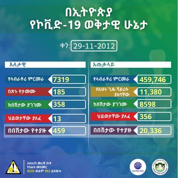 በአዲስ አበባ በ 24 ሰዓታት ውስጥ በተደረጉ አራት ሺህ አምስት መቶ አስራ ስድስት(4,516) የላብራቶሪ ምርመራዎች ሶስት መቶ ሃያ ዘጠኝ (329) ሰዎች ቫይረሱ የተገኘባቸው ሲሆን በአዲስ አበባ ከተማ እስከ ዛሬ ድረስ በተደረጉ ሁለት መቶ ሰባ ሺህ ሁለት መቶ ስድሳ ሶስት (270,263) የላቦራቶሪ ምርመራዎች የኮሮና ቫይረስ የተገኘባቸው ሰዎች ቁጥር አስራ ሶስት ሺህ ስምንት መቶ ሃያ ስድስት(13,826) ደርሷል፡፡ እንዲሁም በ24 ሰዓታት ውስጥ የ ስድስት (6) ሰዎች ህይወት አልፏል። (5 ከሬሳ ምርመራ፣1 ከጤና ተቋም)