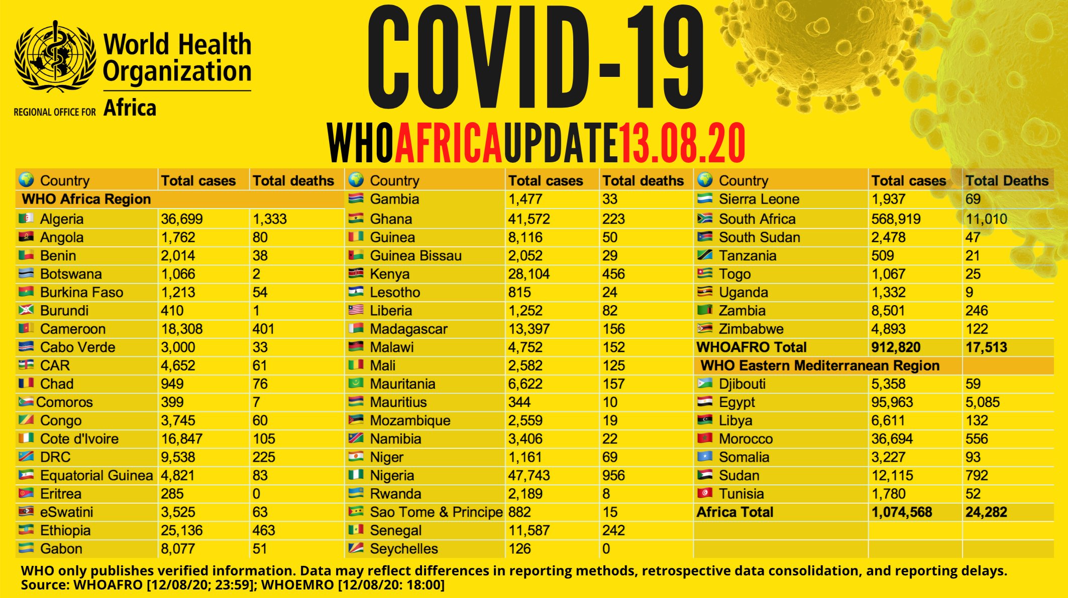 Over 1 million confirmed COVID19 cases on the African continent - with more than 770,000 recoveries & more than 24,000 deaths cumulatively. View country figures & more with the WHO African Region COVID-19 Dashboard: