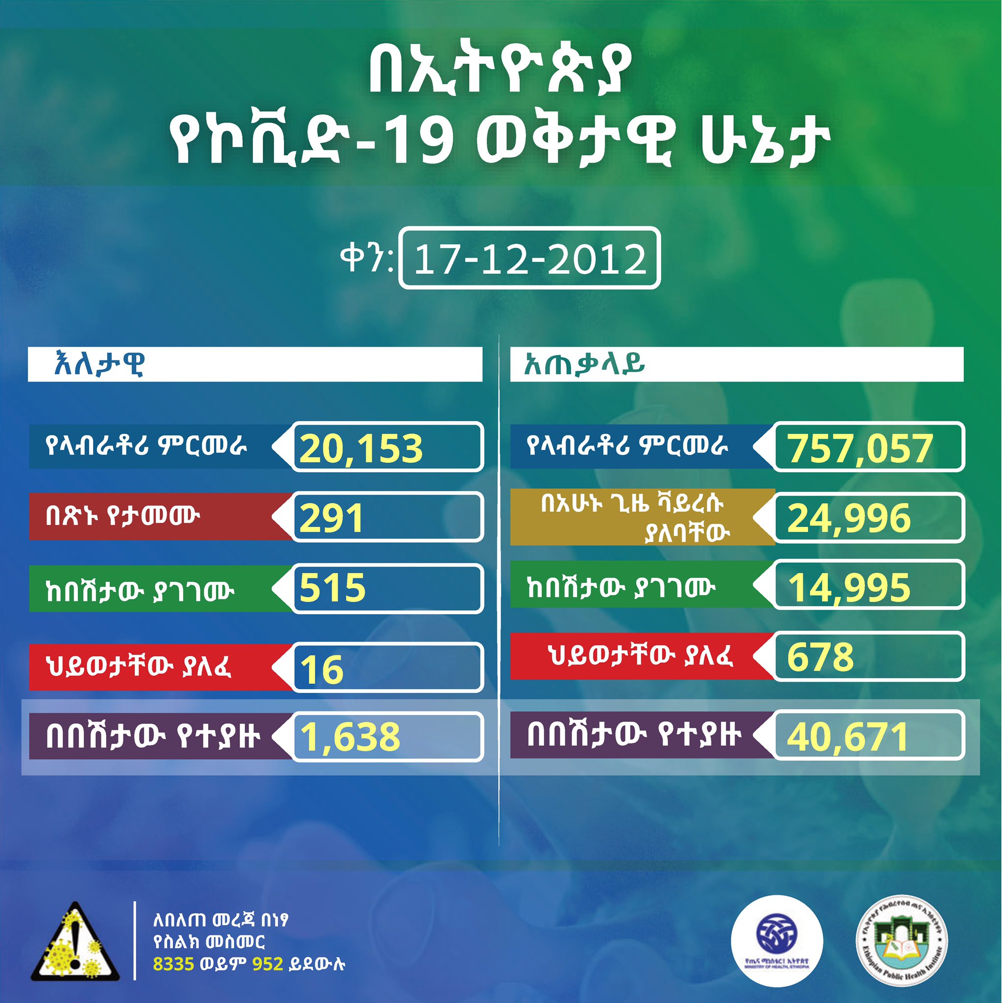 በአዲስ አበባ ከተማ ባለፉት 24 ውስጥ በተደረገው 6,681 የላብራቶሪ ምርመራ 968 ሰዎች በኮሮና ቫይረስ መያዛቸው ተረጋግጧል። እንዲሁም በ24 ሰዓታት ውስጥ የ13 ሰዎች ሰዎች ህይወት አልፏል። (10 ከአስከሬን ምርመራ 3 ከጤና ተቋም)