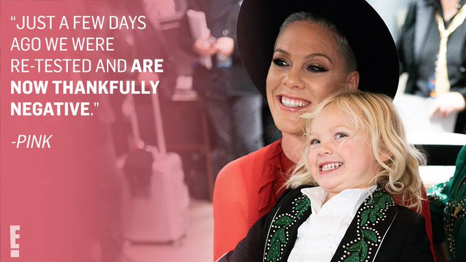The Grammy Award-winning artist revealed in a post that she and her three-year-old son had tested positive for COVID-19 after showing symptoms two weeks ago. @Pink ( https://twitter.com/Pink )