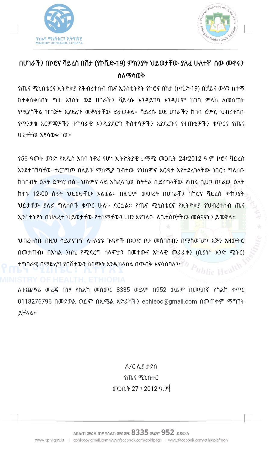 የጤና ሚኒስትሯ ዶክተር ሊያ ታደሰ ዛሬ ማምሻውን ለኢዜአ በሰጡት መግለጫ እንዳስታወቁት ህይወታቸው ያለፈው ሁለተኛው ግለሰብ የ56 ዓመት ወንድና የአዲስ አበባ ነዋሪ የሆኑ ኢትዮጵያዊ ሲሆኑ ቀደም ሲል የውጭ አገር የጉዞ ታሪክ አልነበራቸውም።
