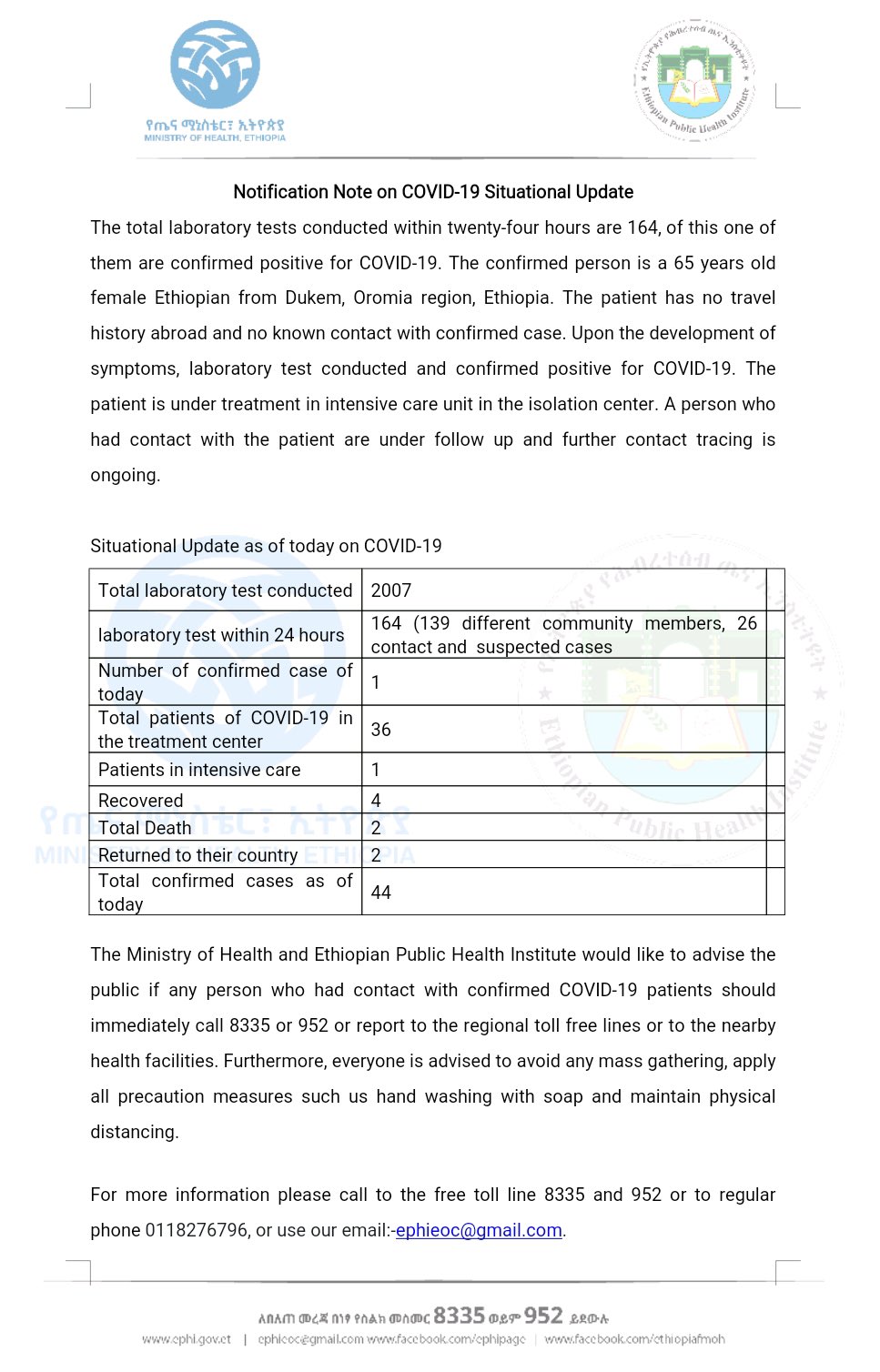 To date 226 cases have been declared positive, of which 92 have been cured, 2 died, 1 evacuated 131 under treatment