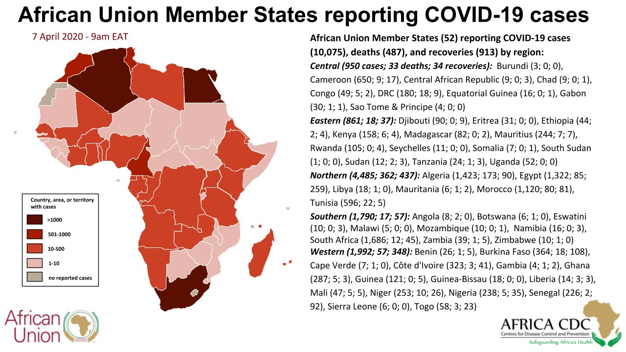 52 African Union Member States reporting 10,075 COVID-19 cases, 487 deaths, and 913 recoveries.