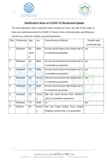 Ethiopia status of the 8 patients who tested positive for COVID19: 5 of them have travel history abroad & came from Dubai. They're being followed at one of the 14-day mandatory quarantine centers; 2 of whom are the 9 month old infant & his mother