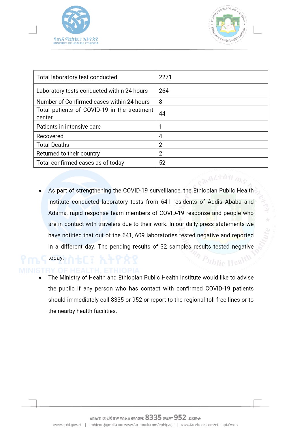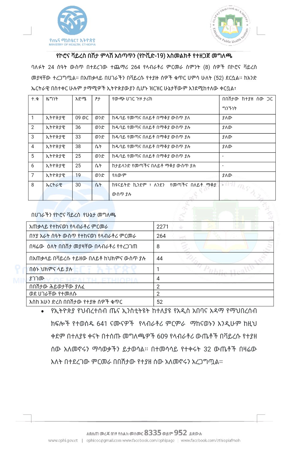 ምርመራ ከተደረገላቸው 264 ሰዎች ውስጥ 8 ሰዎች በኮሮናቫይረስ መያዛቸው ተረጋገጠ።ይህም በኢትዮጵያ በቫይረሱ የተያዙ ሰዎችን ቁጥር 52 አድርሶታል