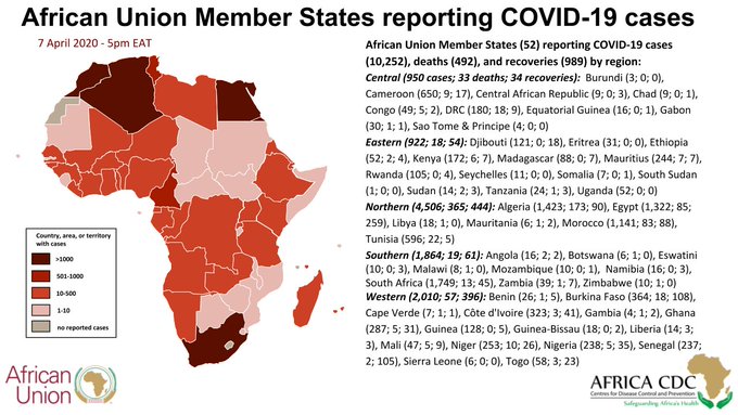 52 African Union Member States reporting 10,252 COVID-19 cases, 492 deaths, and 989 recoveries.