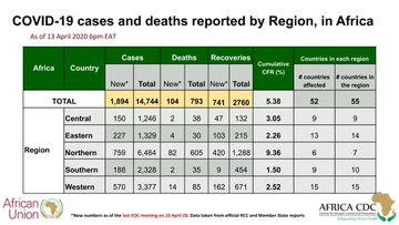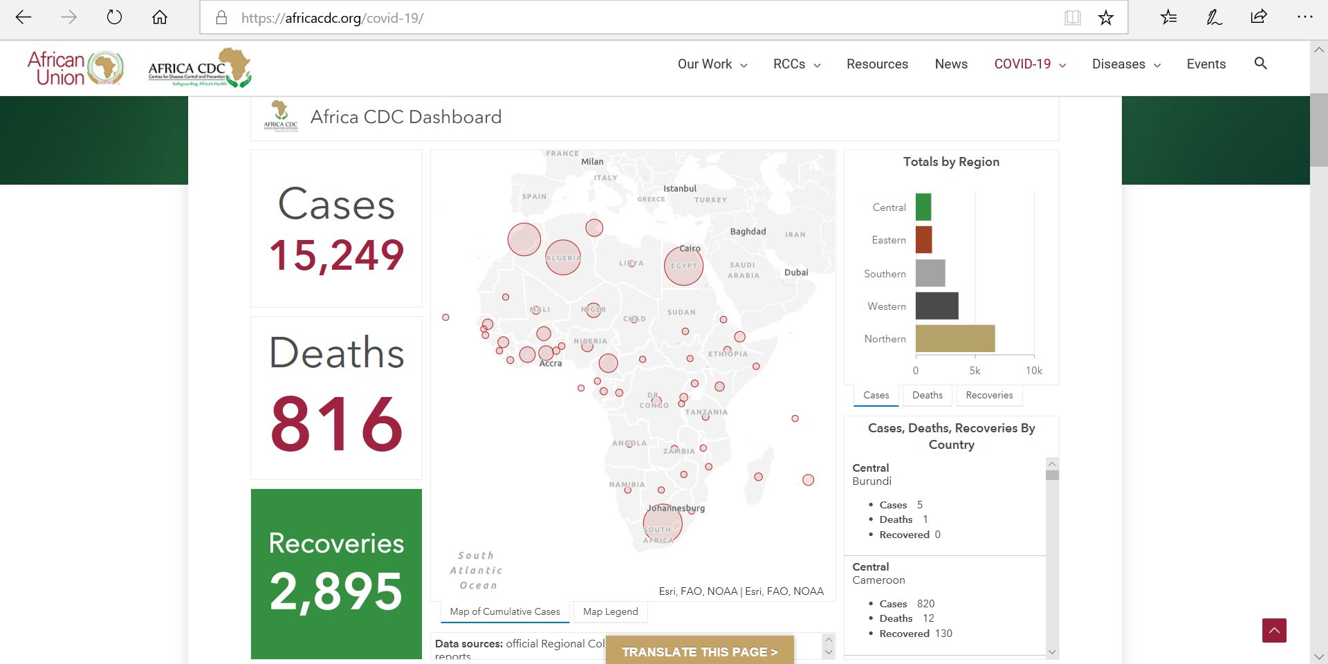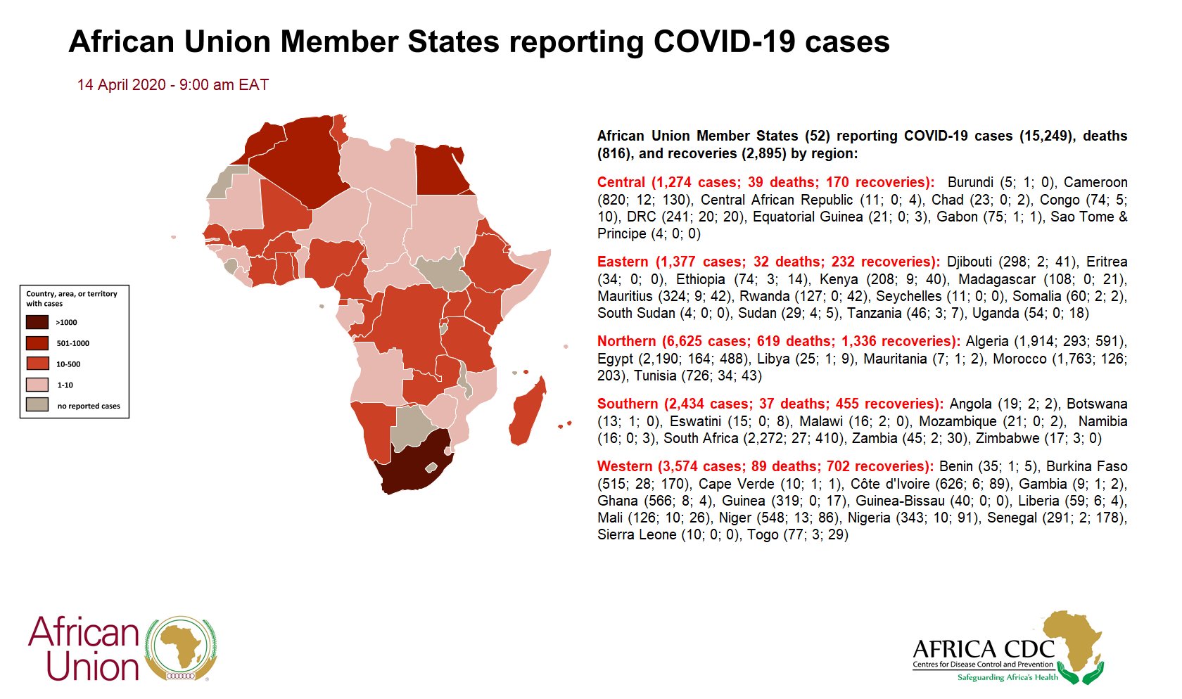 African Union Member States reporting 15,249 COVID-19 cases, 816 deaths & 2,895 recoveries with a Cumulative CFR of 5.34%.