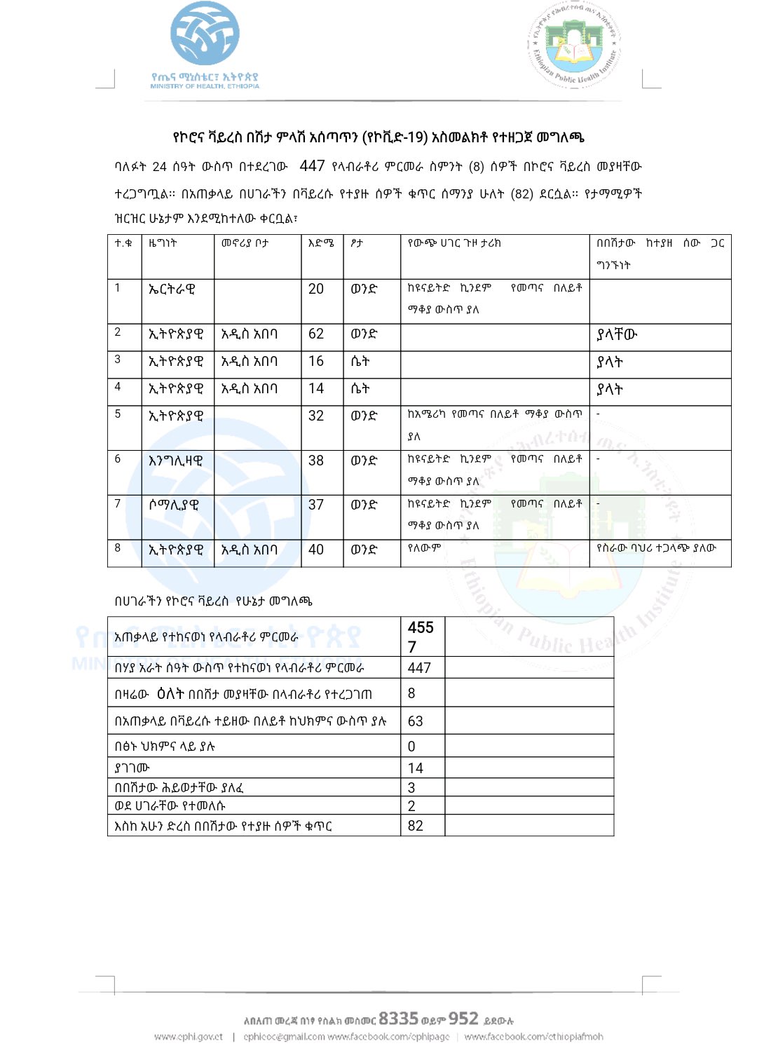በኢትዮጵያ ባለፉት 24 ሰዓታት የላቦራቶሪ ምርመራ ከተደረገላቸው 447 ግለሰቦች መካከል 8 የኮሮና ቫይረስ እንደተገኘባቸው መረጋገጡን የጤና ሚኒስቴር አስታውቋል።