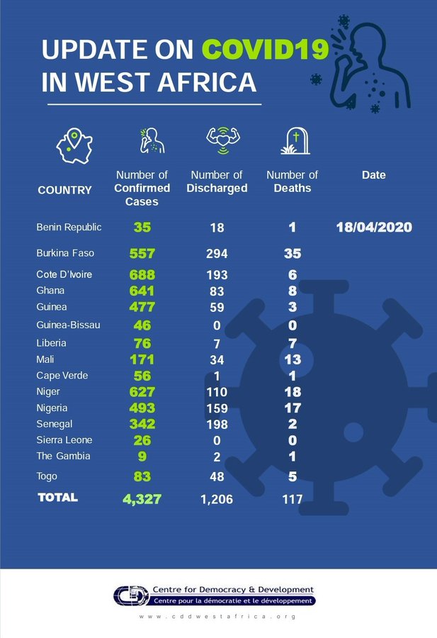Covid19 update in WestAfrica: the region has recorded at least 4,327 confirmed cases, 1,206 persons have recovered and 117 fatalities have also been recorded
