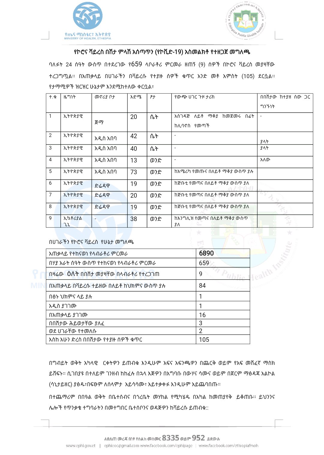 በሐገራችን በኮሮና ቫይረስ የተያዙ ሰዎች 105 ደረሰ