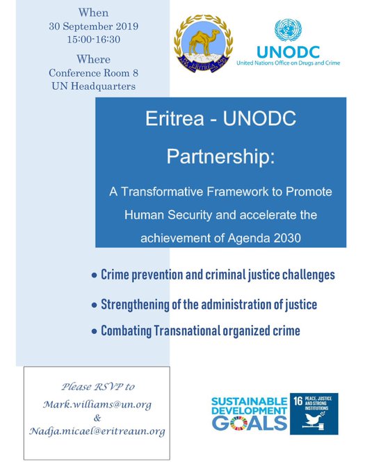 The Permanent Mission of Eritrea and the United Nations Office on Drugs and Crime, will be hosting a side event on September 30th.