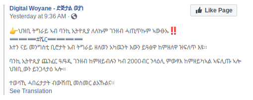 ማንኛውም የባንክ ተጠቃሚ ከ2000 ብር በላይ እንዳይወጣ የዓድዋ ኣፓርታይድ ስርዓት ትእዛዝ ኣስተላልፈዋል ። ይህ ትእዛዝ ከብሄራዊ ባንክ እና የኢትዮጵያ መንግስት እውቅና ውጪ የተወሰደ ነው