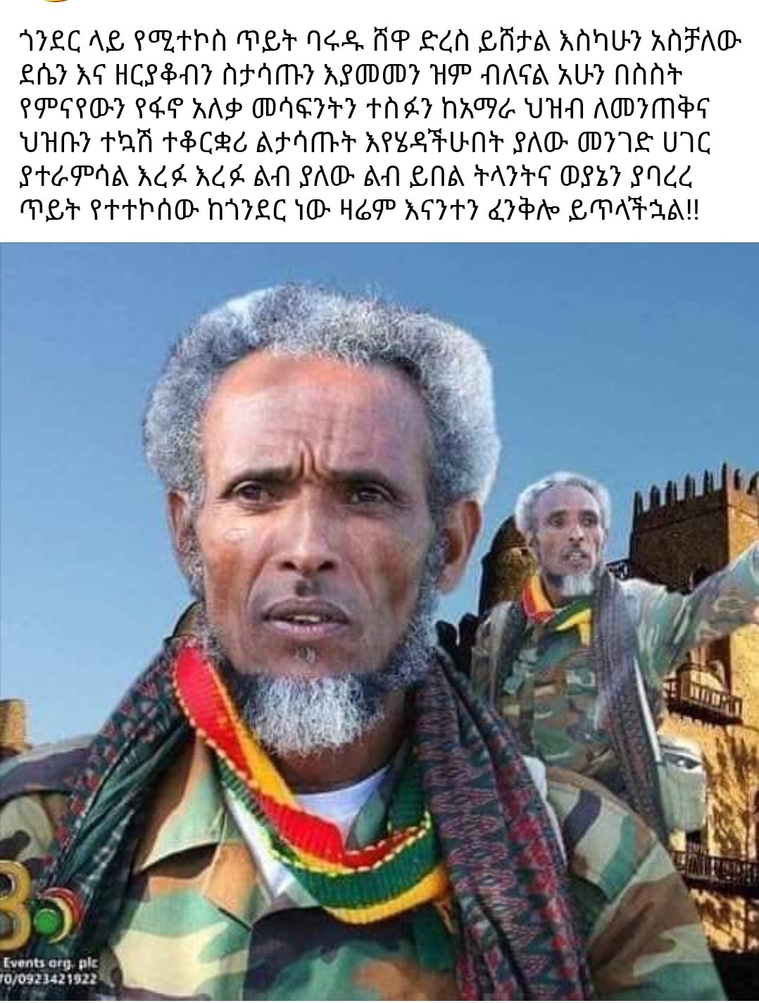 Did he and his bands got killed in yesterday's bombings and long lasting gun battles in Bahir dar and its surroundings. It was carnage up there yesterday. And that is why you came hear to Reveal and sooth your deeply wounded oldy skins. Fanno should stop outlaw activities because the government there and the federal authorities are the only legitimate legal forces to make legal administrative, governance and security issues 100%. Ask fanno to and the so called fake Gobez Aleqoch to hand themselves to the government before it is too late. Okay? Okay!!VIOLA!