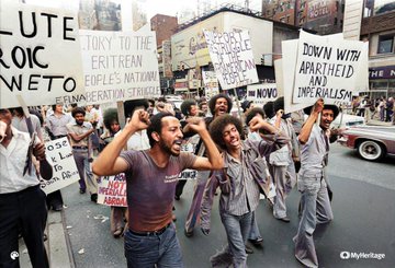 Eritreans demonstrating in support of Eritrean independence & the rights of blacks in NYC, in 1975. Nipsey's father, Dawit Asghedom, is the man on the far right.