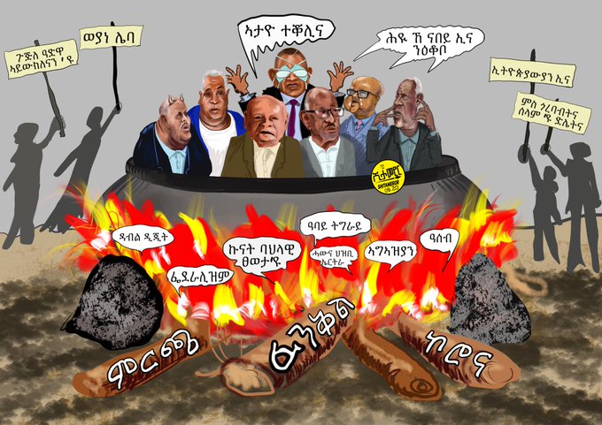 እዛ ንብዝሒ ህዝቢ ኢትዮጵያን ጸጋታቱን እንተላይ ደገፍ ሓያላት ምዕራባዊያን ሃገራት ተኣማሚና፣ ንህዝቢ ኤርትራ ኣንበርኪኻ፣ ካብ'ቲ ዘሳቕያ ሕማም ነብሰ- ምትሓት (inferiority complex) ንኽትናገፍ ሓሊና፣ ኲናት ኣንጻር ህዝቢ ኤርትራ ዝጀመረት ጃንዳ ትግራይ፣ ኣብ'ዚ እዋን ንቤተ መንግስቲ ኣዲስ ኣበባ ኣማዕድያ እንዳጠመተት፣ ኣብ መቐለ ኣኽሱም ሆቴል ተዓሺጋ፣ ንነብሳ ብውስኪን ቢራን እንዳጠበረት፣ ናይ ቁም እስረኛ ኮይና እንዳንባሃቖት ትቑዝም ኣላ።