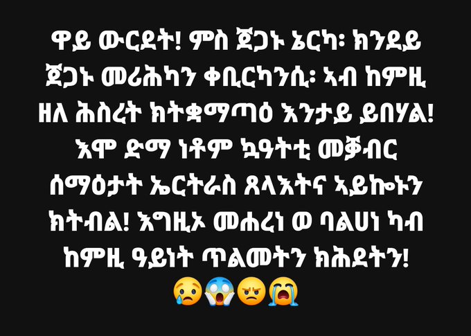 ብርግጽ ኣብ እርጋኑን ቁርባኑን ዝጸየቐሉ ድምሱስ ፍጥረት። ኣቤት ኣታ ኣምላኽ ካብዚ ውርደት'ዚ ኣድሕነና። ክልተ ግዜ ኣይተጸዋዓና። ሓደ ሓደ ግዜ 'ሞት ክዳን'ዩ' ዝብልዎስ ከምዝን ወዲ ከምዝን ከይርከብ'ዩ። ኣምላኽ እንተ ዝፈትዎ ነሩ ቀደም ብሽፍኑ መኣከቦ ነሩ። ግና ኣይተዓደለን።