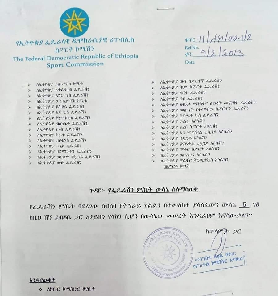 The Tgray killil, banned from participating in any sports events in Ethiopia.
