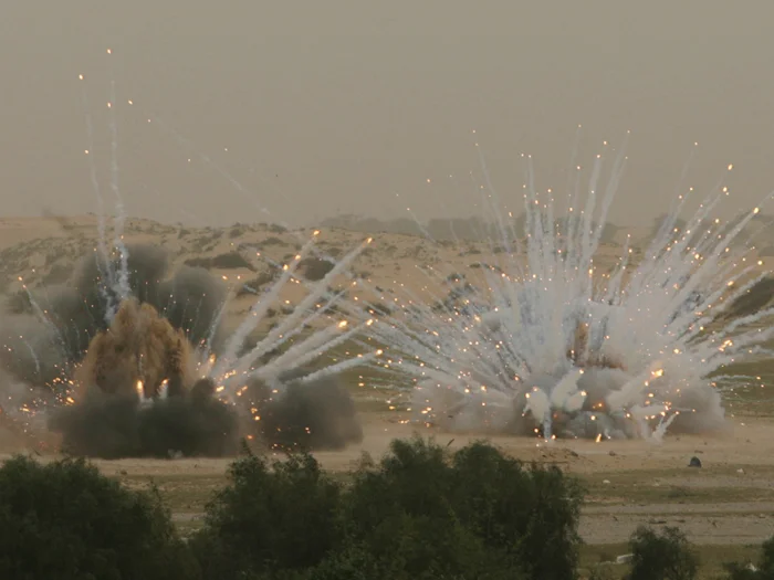 White phosphorus munitions are blown up by U.N. and Hamas sappers, not seen, in the Khan Younis refugee camp in the Gaza Strip in March 2010. The munitions remained unexploded since the Gaza war in 2008, when they were fired. Eyad Baba/AP