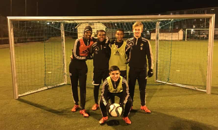 Alexander Isak (left) and Alexander Snäcke (right) with some of their young teammates during winter training. Photograph: AIK Stockholm