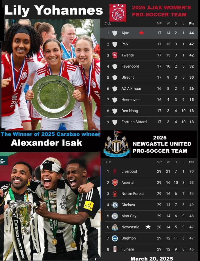 Lily Yohannes' Ajax Women's Pro-Soccer Team leading the 2025 women's Soccer league and Alexander Isak's Newcastle United Pro-Soccer team the winner of the 2025 Carabao Cup Championships March 16, 2025 and 6th in the Premier League. We are proud of you! 🇪🇷