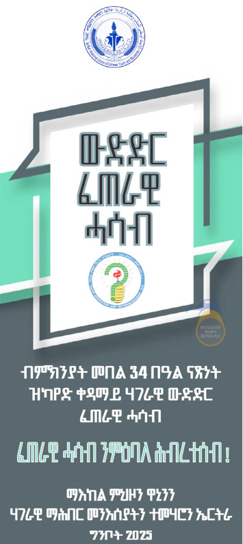 እዚ ዝተገልጸ፡ ነቲ ብምኽንያት መበል 34 በዓል ናጽነት ከካይዶ መዲቡ ዘሎ ፈላሚ መደብ ውድድር ፈጠራዊ ሓሳብ፡ ኣቐዲሙ ንዘዳለዎ ንድፊ ኣገባብ ትግባረ ዝያዳ ኣድማዕን ውጽኢታውን ንምግባሩ፡ ብ17 ሚያዝያ ኣብ ኣስመራ - ማእከል ምህዞን ዋኒንን ኣብ ዘቃንዖ ዓውደ- ዘተ’ዩ።