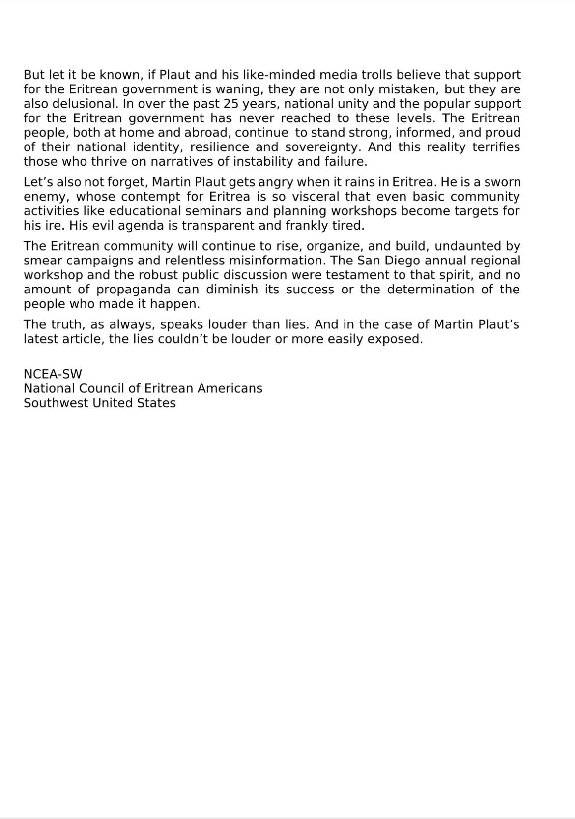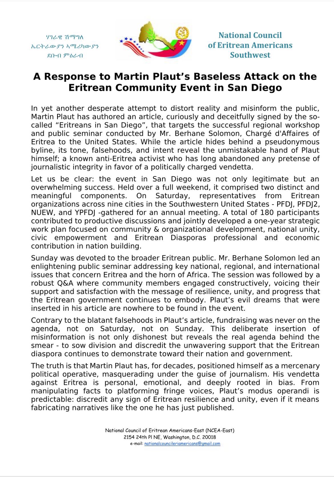 The National Council of Eritrean Americans in the Southwest conducted its 12th Congress in Santiago, California. Additionally, the national committee of Eritreans in Lancaster, California, held a public meeting. At the meeting, Mr. Berhane Gebrehiwet, Chargé d’Affaires at the Eritrean Embassy, urged nationals—especially the youth—to strengthen their organizational capacity and actively participate in national affairs.